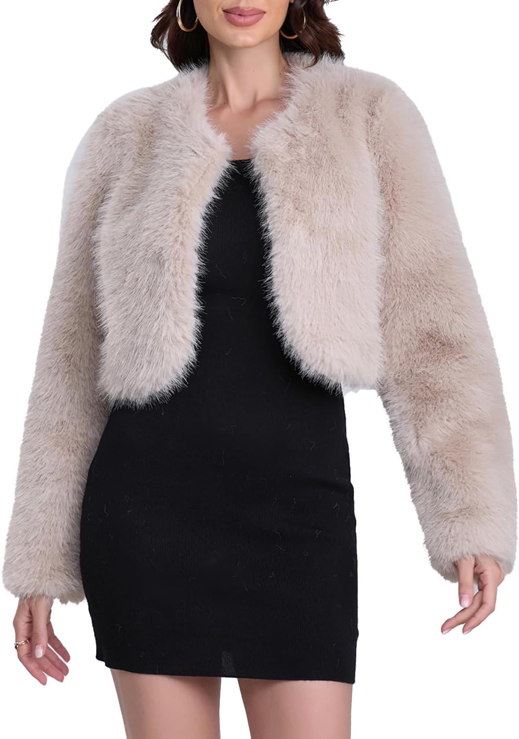 Women’s Faux Fur Cropped Coat Long Sleeve Open Front Winter Jacket