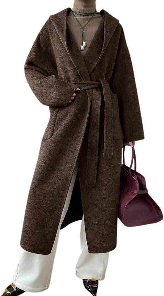 Women’s Winter Open Front Belted Wool Coat Casual Loose Hooded Midi Long Winter Pea Coat