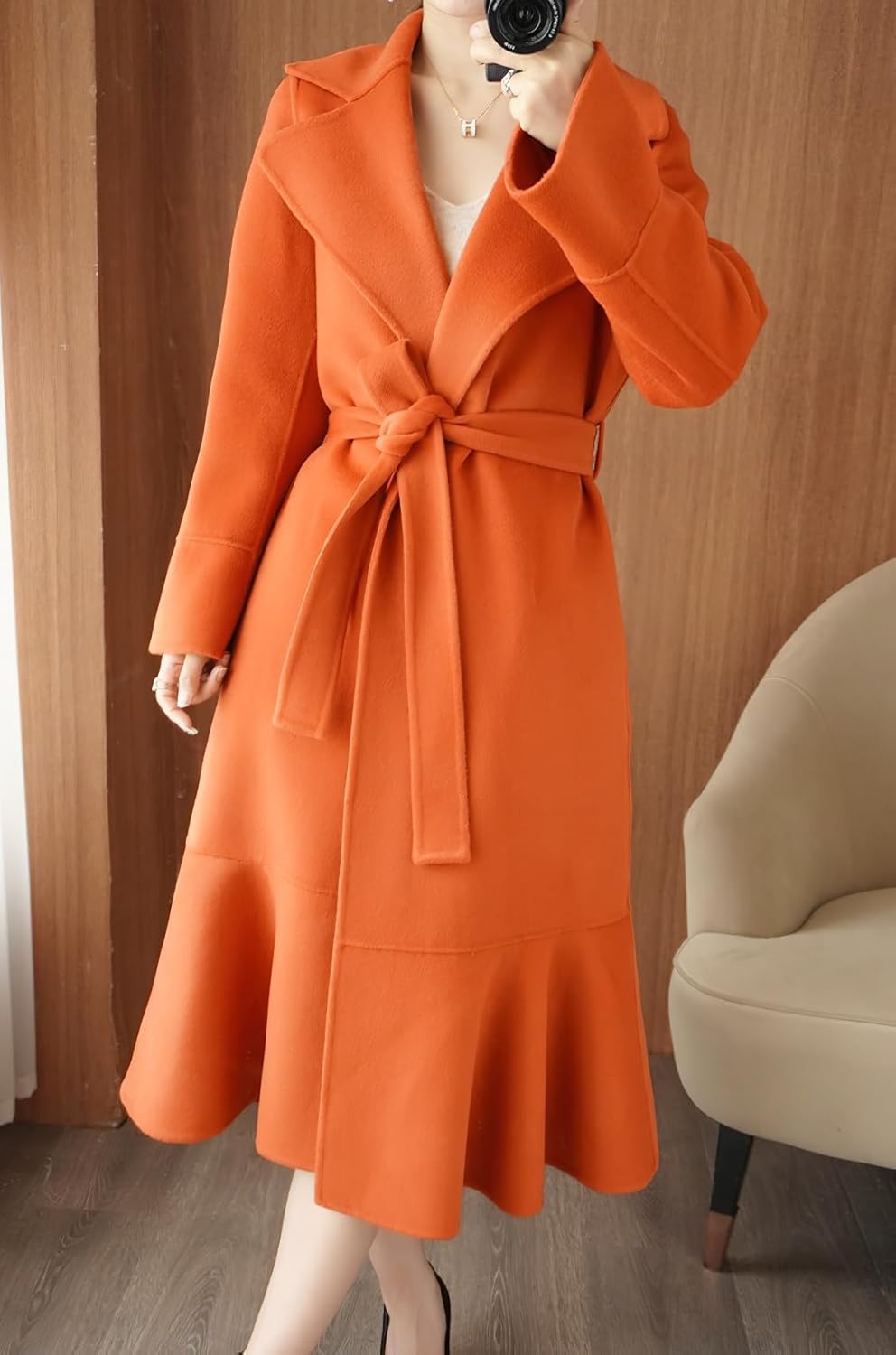 Women’s Winter Wool Trench Coat Flare Fishtail Hem Loose Fit Warm Mid Long Overcoat with Belt